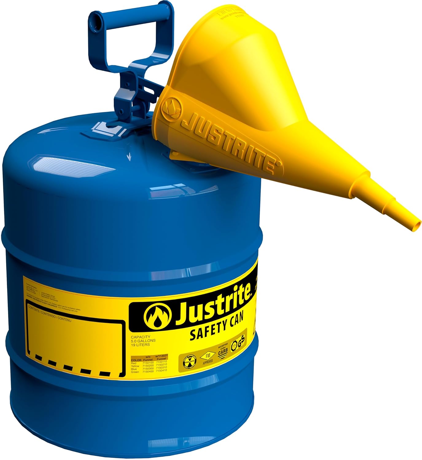Justrite Type I Safety Cans are the ideal safety can for any home or business. Justrite Type I compliant and economical safety cans reduce fire risks and make everyday use of flammables easier and safer. Designed with a single spout for filling and pouring, the sealed lid features automatic positive-pressure relief that vents between 3 and 5 psig (0.2 and 0.35 bar) to guard against rupture or explosion. Protection features include a 3.5-inches long chemical resistant stainless steel flame arrester that stops flashback ignition, provides faster liquid flow, and offers exceptional durability. The self-venting, self-closing leakproof lid prevents ruptures from pressure build-up and controls vapors and spills. Warning label includes an extra large ID zone for user labeling of contents to avoid misuse, reduce the potential for incompatible mixtures, or may be used to designate department or individual owner. Made of galvanized steel with a tough powder paint finish, each can is tested to guarantee 100% leakproof construction. The tough powder-coat finish resists chemicals and stands up to demands of rigorous use. This safety can include a polypropylene funnel for easy pouring liquid into small openings. The funnel attaches to the spout neck of Type I Safety cans that are sized 1 gallon (4L) and larger. The two-position funnel folds down for when you fill or store the can and stays up for when you pour. Faster liquid flow. Identify contents to reduce misuse or incompatible mixtures. Designate department location, work shift, crew or individual user. Meets OSHA and NFPA. FM Approved, UL/ULC listed, Carb compliant, TUV certified. Founded in 1906, Justrite is the leading storage, handling, and workplace safety product manufacturer. Our flagship product is the Justrite Safety Can, the #1 safety can for storing and transferring flammable liquids.