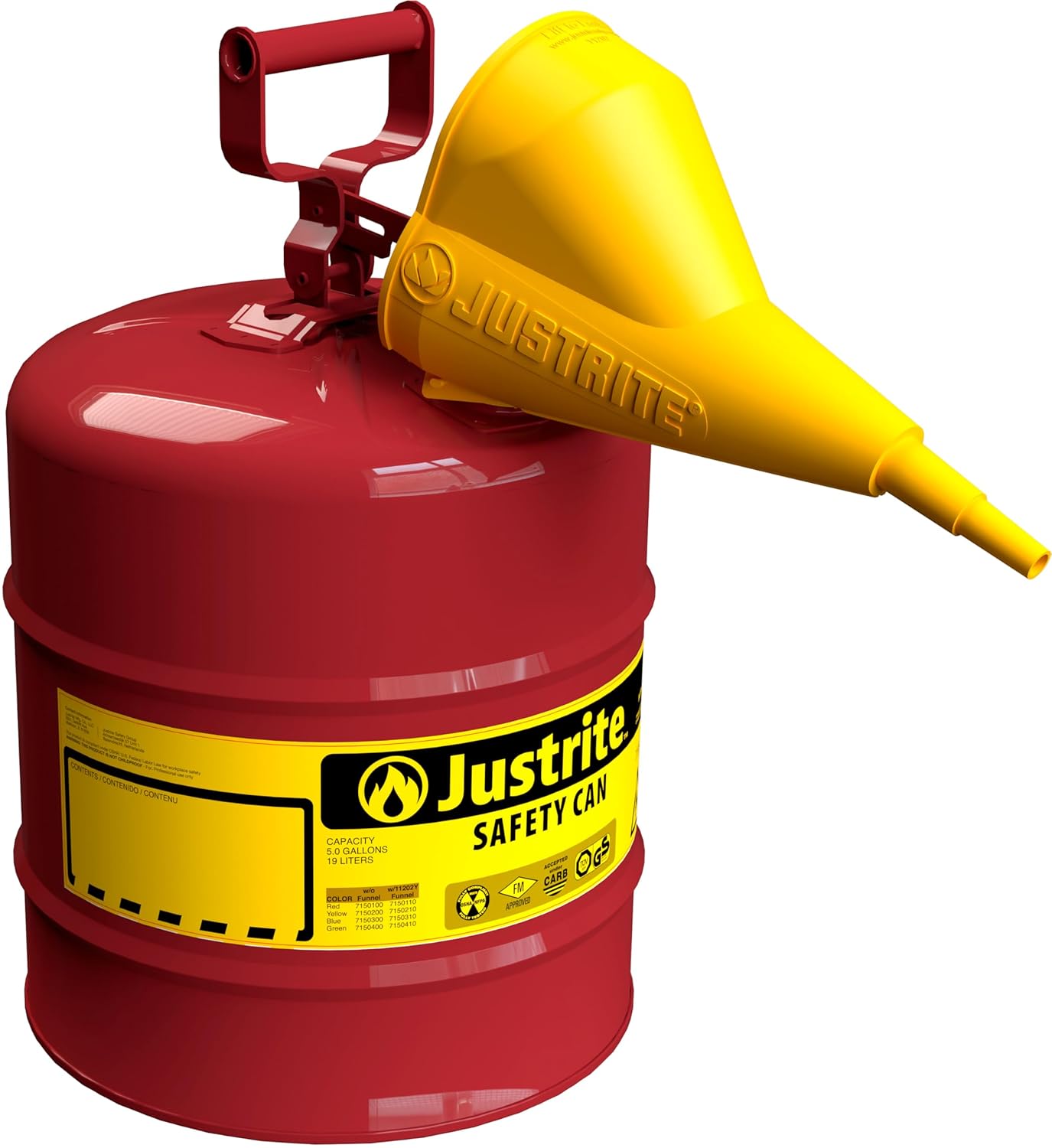 Justrite Type I Safety Cans are the ideal safety can for any home or business. Justrite Type I compliant and economical safety cans reduce fire risks and make everyday use of flammables easier and safer. Designed with a single spout for filling and pouring, the sealed lid features automatic positive-pressure relief that vents between 3 and 5 psig (0.2 and 0.35 bar) to guard against rupture or explosion. Protection features include a 3.5-inches long chemical resistant stainless steel flame arrester that stops flashback ignition, provides faster liquid flow, and offers exceptional durability. The self-venting, self-closing leakproof lid prevents ruptures from pressure build-up and controls vapors and spills. Warning label includes an extra large ID zone for user labeling of contents to avoid misuse, reduce the potential for incompatible mixtures, or may be used to designate department or individual owner. Made of galvanized steel with a tough powder paint finish, each can is tested to guarantee 100% leakproof construction. The tough powder-coat finish resists chemicals and stands up to demands of rigorous use. This safety can include a polypropylene funnel for easy pouring liquid into small openings. The funnel attaches to the spout neck of Type I Safety cans that are sized 1 gallon (4L) and larger. The two-position funnel folds down for when you fill or store the can and stays up for when you pour. Faster liquid flow. Identify contents to reduce misuse or incompatible mixtures. Designate department location, work shift, crew or individual user. Meets OSHA and NFPA. FM Approved, UL/ULC listed, Carb compliant, TUV certified. Founded in 1906, Justrite is the leading storage, handling, and workplace safety product manufacturer. Our flagship product is the Justrite Safety Can, the #1 safety can for storing and transferring flammable liquids.