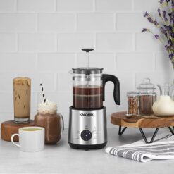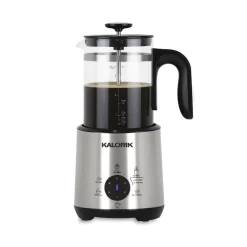 Meet your very own personal barista! This 8-in-1 beverage maker brings an authentic coffee shop feel into the comfort of your kitchen. The Kalorik Bartista gives you all the bold, flavorful benefits of a French press, with the versatility of an artisanal cafe. The Kalorik Bartista can make cold brew coffee or tea, hot coffee or tea, hot chocolate, cappuccinos, lattes and cold foam – at the touch of a button. This innovative electric French press features six one-touch presets for creating a wide variety of hot and cold barista-style beverages. A magnetic drive motor and frothing disc deliver rich and airy frothed milk, perfect for making cappuccinos, macchiatos, lattes, and hot chocolate. The special chocolate melting function allows you to add chocolate chips or chunks directly into the pitcher to make decadent hot chocolate. The stainless steel cage prevents the stirring element from getting clogged during melting. The Bartista comes with a removable glass pitcher and a French press accessory. A high-power heating element reaches up to 200°F. A 24-oz brewing capacity yields 3 large servings of coffee, or 2 servings of frothed milk.