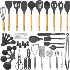 Kaluns 50 PCS Silicone Kitchen Utensils Set Complete Kitchen Set – 800°F Heat Resistant Non-Stick Premium Silicone Cooking Utensils W Wooden Handles – Can Opener, Masher, Turner, Silicone Spatula Set, Gray