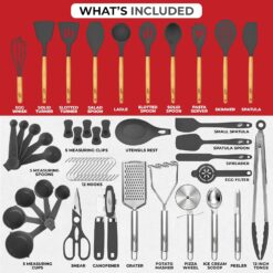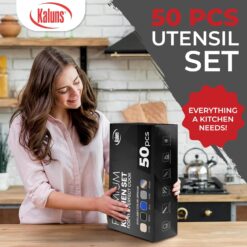 - Complete 50Pcs Set: The Kaluns utensil set includes everything you need for a complete cooking experience. You’ll receive: slotted turner, ladle, salad spoon, solid turner, solid spoon, pasta server, slotted spoon, skimmer, spatula, utensil rest, can opener, egg separator, small spatula, spatula spoon, kitchen shears, 12” tongs, 12 x kitchen hooks, 5 x measuring cups, 5 x chip clips and 5 x measuring spoons, can opener, grater, pizza cutter, veggie peeler, ice cream scoop, a total of 50 pieces!