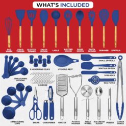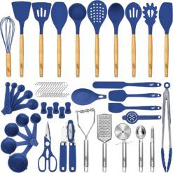 Kaluns 50 PCS Silicone Kitchen Utensils Set Complete Kitchen Set – 800°F Heat Resistant Non-Stick Premium Silicone Cooking Utensils W Wooden Handles – Can Opener, Masher, Turner, Silicone Spatula Set, Blue