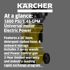 - Karcher promise – cleaner quicker: with a powerful 1800 psi/1.45 GPM motor the K 3 power control is perfect for cleaning concrete, pavement, driveways, patios, decks, sidewalks, RVs, cars, boats, homes, fencing, and more