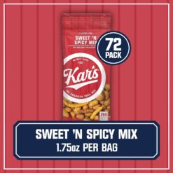 - TOTALLY SATISFYING NUT SNACKS – Satisfy every craving with Kar’s Nuts Sweet ‘N Spicy Trail Mix packets. This box of bulk trail mix includes (72) 1.75 oz individually wrapped snacks.