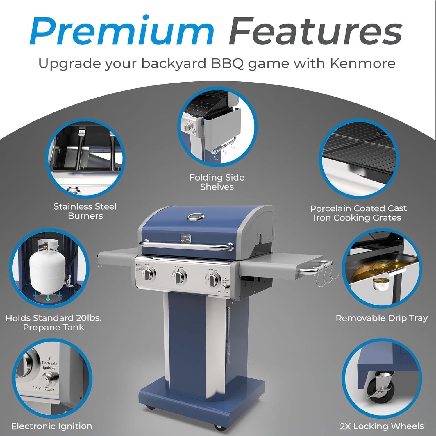 Kenmore 3-Burner Propane BBQ Grill, 30,000 BTUs Gas Grill with Cast Iron Cooking Grates, Folding Side Tables & Wheels, Outdoor Grill with Tool Hooks, Azure Blue