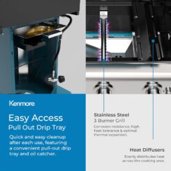 - 4 CASTER WHEELS FOR EASY MOBILITY – Who needs muscles when you’ve got wheels? The Kenmore 3-Burner Gas Grill comes equipped with 4 smooth-rolling wheels, 2 of which lock for added security and stability. No heavy lifting required! Take this grill on the go and lock it into place wherever you desire. Whether you’re grilling up a storm on your backyard patio or taking it on the road to your next tailgate, this grill’s got your back.