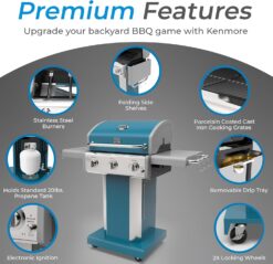 | Model Name | Kenmore 3-Burner Propane BBQ Grill, 30,000 BTUs Gas Grill with Cast Iron Cooking Grates, Folding Side Tables & Wheels, Outdoor Grill with Tool Hooks, Teal |