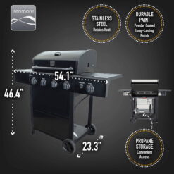- Kenmore 4-Burner Outdoor BBQ Gas Grill with Side Burner, Open Cart Design Style in 3 color options: Black, Stainless Steel, and Stainless Steel/Black