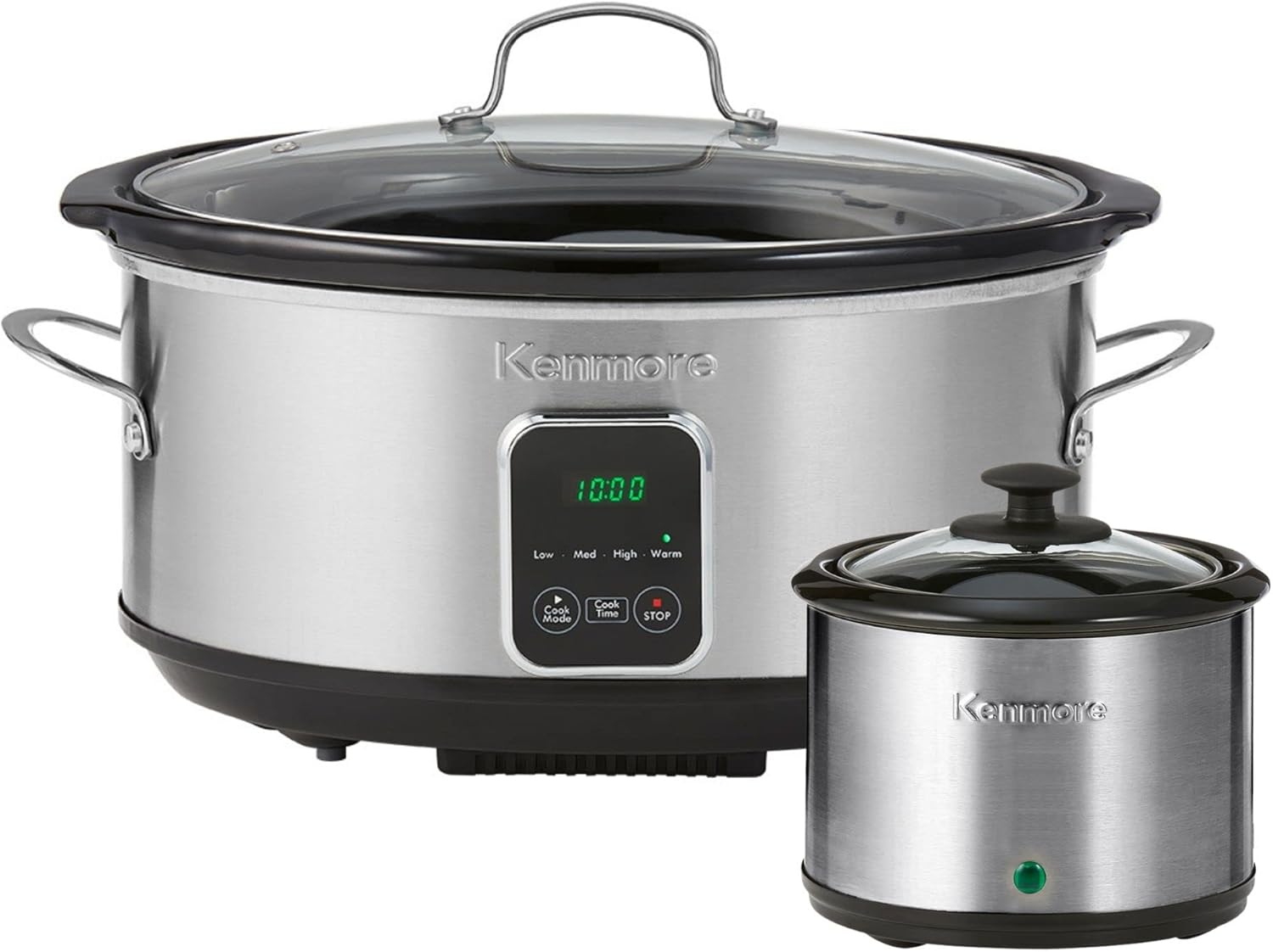 This programmable slow cooker lets you prepare a delicious home-cooked meal even when you’re not at home. The 7 Quart Programmable Slow-Cooker from Kenmore is an indispensable kitchen helper for everyone from busy families to college students. Simply add your ingredients, set the timer, and come home to a hot meal that’s ready when you are. This crockpot’s 7 quart capacity and oval shape can easily make plenty for everyone without taking up too much of your valuable counter space. Whatever your recipe, slow-cooking locks in moisture for a rich, flavorful meal every time. The bonus “Dipper” sauce warmer is perfect for keeping your gravy or sauce piping hot at the table or serving a delicious warm dip to please a crowd. And when you’re finished, the stainless steel housing and handles easily wipe down while the ceramic inserts and tempered glass lids are dishwasher-safe for effortless cleanup.