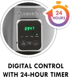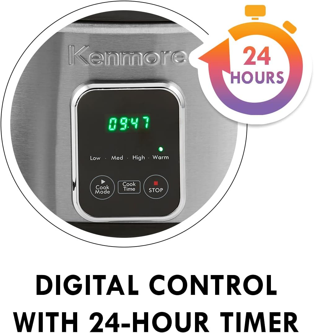 Kenmore 7 Quart Slow Cooker Programmable Kitchen Appliance Dipper Sauce-Warmer Stainless Steel Digital Display One-Touch Controls Braise Simmer Sous Vide Stew Soup Chili Curry Black and Silver