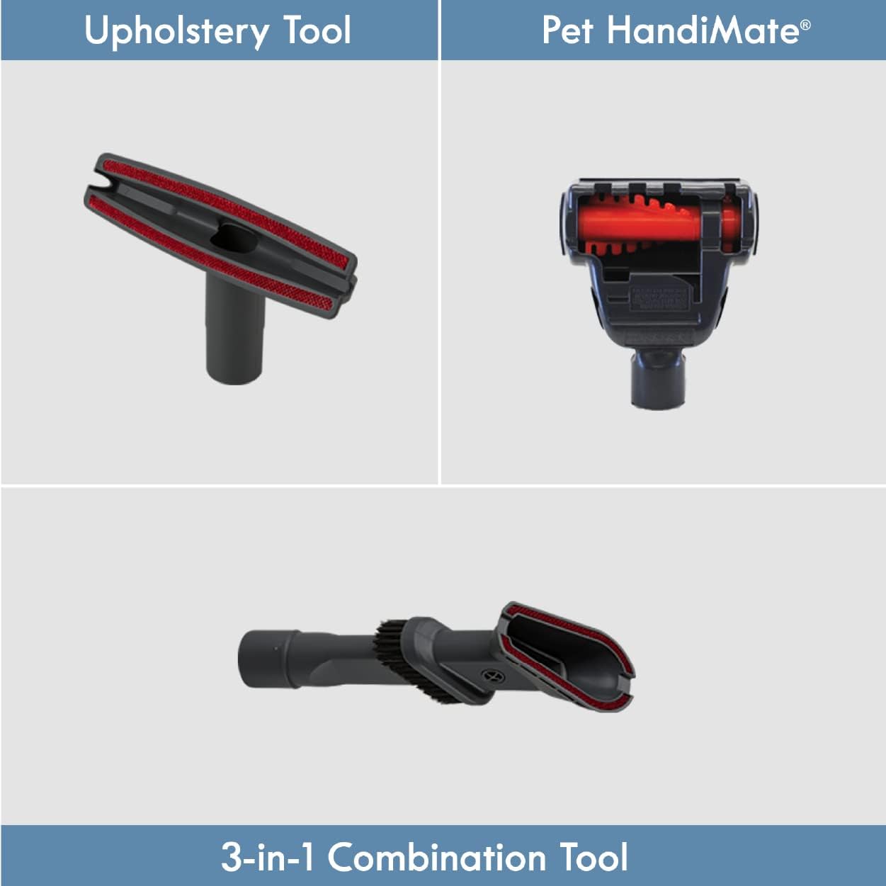 - VERSATILE TOOLS: An upholstery brush, a 3-in-1 combination tool featuring a crevice tool, dusting brush and upholstery tool, and a Pet HandiMate tool for whole home cleaning