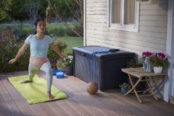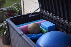 This eye-catching deck storage box by Keter boasts a thoughtful design that includes many clever features. Because it is made out of polypropylene instead of natural rattan, it won’t rust, peel or dent. An automatic opening mechanism comes in handy for times when your hands are full, and its 110-gallon capacity ensures that it can comfortably accommodate a large variety of things.