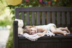 As pretty as it is purposeful, the Keter 60 gallon patio storage bench has a gorgeous high-backed design that will fit in with even the most beautiful garden while providing comfortable seating for two adults and a storage capacity of 60 gallons. It’s constructed out of a durable and weather-resistant resin that makes this a low-maintenance addition to any outdoor space. As an added bonus, this bench is easy to assemble and can be locked to keep your contents safe (lock not included).
