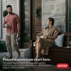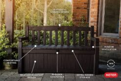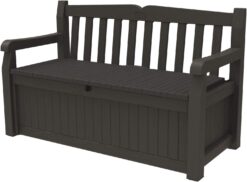 Keter Solana 70 Gallon Storage Bench Deck Box for Patio Furniture, Front Porch Decor and Outdoor Seating – Perfect to Store Garden Tools and Pool Toys, Brown