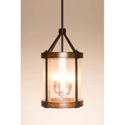 - Distressed black and wood tone finish pendant from the Barrington collection offers a touch of rustic elegance