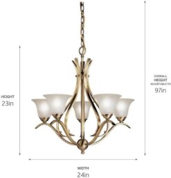 The Dover 23″ 5 light chandelier features a transitional look with gentle curves and etched seeded glass and Tannery Bronze finish. The Dover chandelier is perfect in several aesthetic environments including transitional and traditional.
