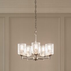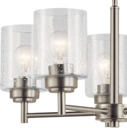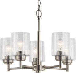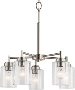 The Winslow 19.75″ 5 light chandelier features a classic look with its Brushed Nickel finish and clear seeded glass. Winslow chandelier is perfect in several aesthetic environments, including traditional and transitional.