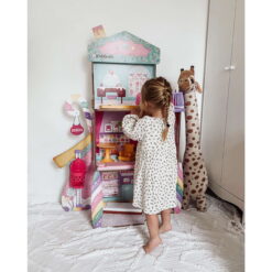 - 3 levels with 7 play areas, including a store, bathroom, bedroom and balcony
