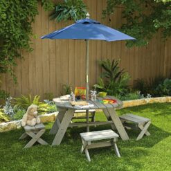 KidKraft Wooden Octagon Table, Stools & Umbrella Set, Kids’ Outdoor Furniture, Barnwood Gray & Navy