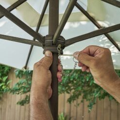 - Umbrella attaches to back of sectional with hook and loop closures