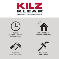 New Look, Same Great Formula, KILZ KLEAR 5 gal. High Performance Primer and Sealer is a fast-dry multi-surface clear primer developed to seal most surfaces inside and outside your home. KILZ KLEAR is particularly effective for “same color painting”. Kilz Klear is tough, flexible and breathable with excellent adhesion. Use on almost all interior and exterior surfaces including drywall, plaster, wood, galvanized, aluminum, architectural plastics, masonry and brick.