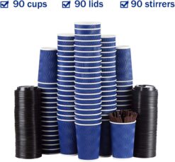 Kindpack Disposable Coffee Cups with Lids and Straws 12 oz (90 Set) – Hot Paper Coffee Togo Cup with Lid To Go for Hot/Cold Beverages Espresso Tea Water Insulated Reusable Durable Drinks Ripple Cups