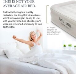 - KING KOIL’S TWIN AIR MATTRESS OFFERS ULTIMATE COMFORT & LUXURY WITH A 1-YEAR WARRANTY DIRECT FROM THE MANUFACTURER: Experience unmatched comfort with our Twin-sized airbed, showcasing a plush pillow top, soft flocking layer, and robust coil-beam construction for superior support. Crafted with durable, waterproof, and puncture-resistant materials, this twin air mattress promises a restorative sleep every night.