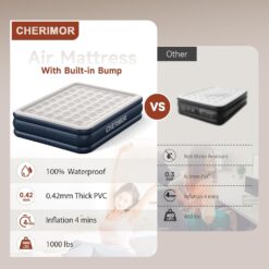 - As Comfortable as a Real Mattress: The 48 air coil beam construction evenly distributes weight, with a maximum load capacity of 1000 pounds, providing ample full-body support for an excellent night’s rest. Sleeping on the CHERIMOR Inflatable Mattress feels like resting on a giant soft pillow.