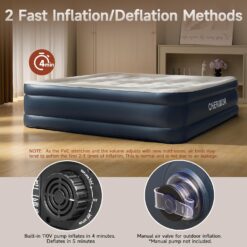 - Effortless Setup: Say goodbye to manual inflation! Our one-touch button facilitates effortless inflation and deflation. The king size air mattress with built-in high-volume pump that quickly inflates the mattress to your desired firmness in just 4 minutes.