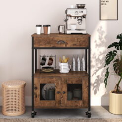 This mobile kitchen island has the sturdy top can hold a microwave oven or toaster. There is an open shelf in the middle of the microwave cart and the drawer below with doors of the coffee cart, you can put some large items or snacks. Making your kitchen cleaner and more convenient and easy to access.