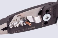 KNIPEX Tools new patent pending Forged Wire Stripper is a true game changer. It strips solid and stranded wire 10-20 AWG. Wire locating ridges make it easy to find stripping holes. It cuts 6-32 and 8-32 screws without threading from either the front or back of the tool. Cutting blades are designed to cut individual wires, NM-B, BX/MC, and battery cable. Lock can be used either right or left handed. Knurled tip and wide flat jaws for better grip. Also includes wire looping groove and gripping area for pipes.
