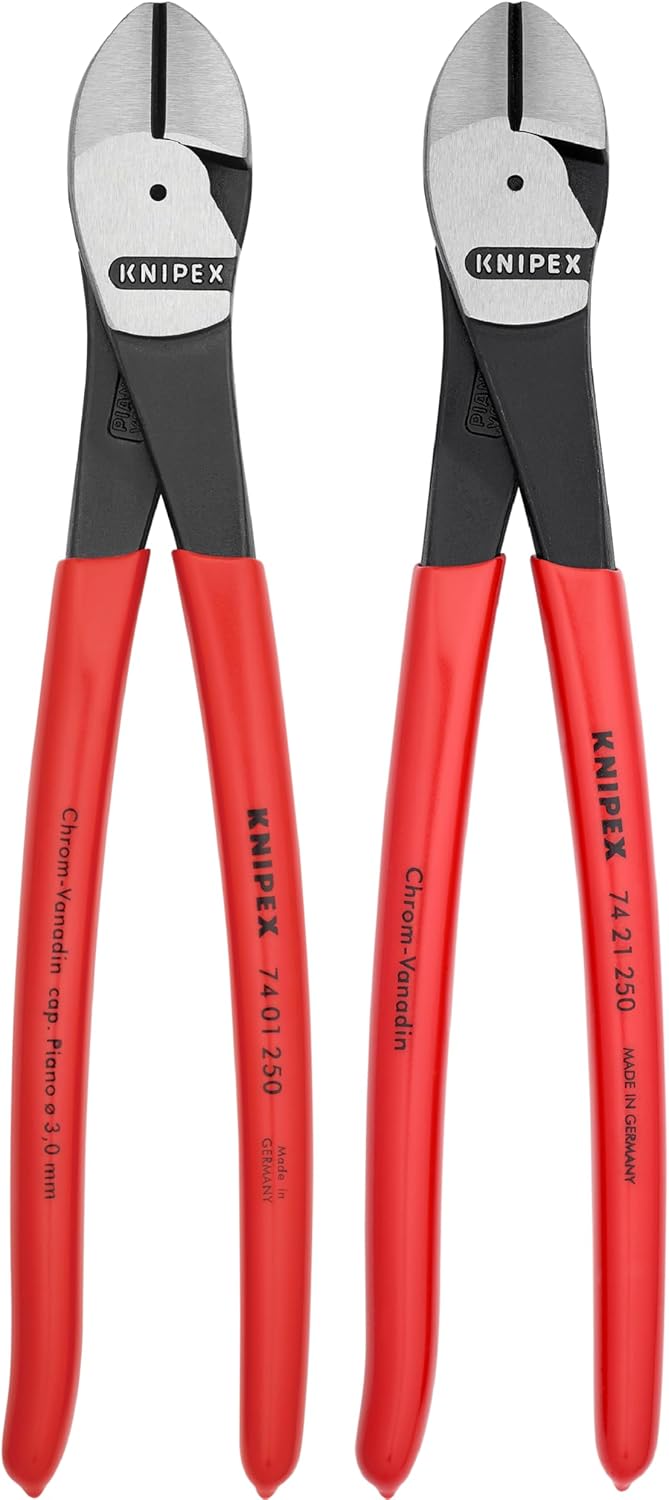 This KNIPEX diagonal cutters set offers two of the most popular 10″ diagonal pliers, one straight and one with a 12° angled head. The combination of the cutting edges, high leverage joints and the long handles have been designed for maximum cutting power. 20% reduction in required force compared to conventional diagonal cutters of the same length. Precision cutting edges (cutting edge hardness approx. 64 HRC) cuts several types of wire including piano wire. High leverage means less force required because the rivet is closer to the cutting edge. Cutting Capacity – up to 3/16″ for medium wire, up to 9/64″ for hard and up to 1/8″ for piano wire. For very tough, continuous use. 74 21 250 offers an angled head for additional hand clearance when cutting. 10″ length suitable for copper conductors up to 16 mm² and aluminum conductors up to 35 mm².