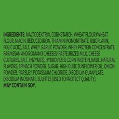 Maltodextrin, Corn Starch, Wheat Flour( Wheat Flour, Niacin, Reduced Iron, Thiamin Mononitrate, Riboflavin, Folic Acid), Salt, Whey, Garlic Powder, Whey Protein Concentrate, Parmesan And Romano Cheeses ( Pasteurized Milk, Cheese Cultures, Salt, Enzymes), Hydrolyzed Corn Protein, Basil, Natural Flavor (Soy), Spanich Powder, Sugar, High Oleic Sunflower Oil, Onion Powder, Parsley, Potassium Chloride, Disodium Guanylate, Disodium Inosinate, Sulfites( Used To Protect Quality). Dehydrated.