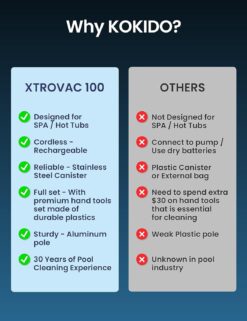KOKIDO 5-in-1 Rechargeable Pool Hot Tub Vacuum Essential Kit – Multi-Angle Head, Section Pole and 3 Hand Tools: Skimmer, Scrubber and Brush. Ideal for Inflatable Spa, Hot Tub, Small Pools, Xtrovac100