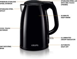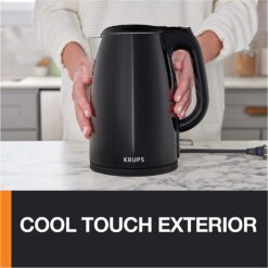 Krups Cool Touch Plastic and Stainless Steel Electric Kettle 1.5 Liter 1500 Watts Double Wall, Fast Boiling, Auto Off, Keep Warm, Cordless Black