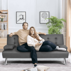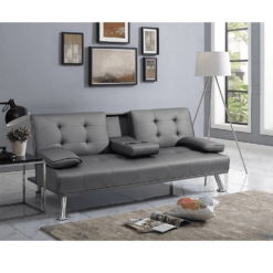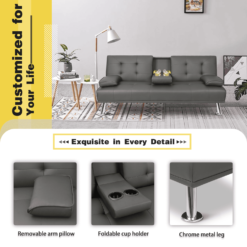 Lacoo Modern Faux Leather Convertible Futon with Cup Holders & Pillows, Grey