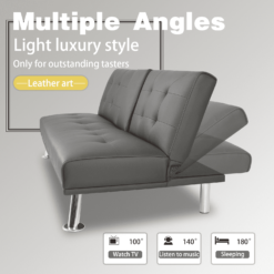 Convertible futon sofa bed with black timeless design is the best bet for any modern living space. This futon sofa can be adjusted 3 angles from 100Ëš to 180Ëš, suitable for watching TV, listening to music, accommodating overnight guests or enjoying your afternoon resting time. Plus the two removable armrests can be used as pillows, then you can lean on them to relax yourself. Superior quality PU leather upholstery and high density foam seat cushion bring a touch of sophistication of your sofa and the coziness of the space. A fold-down middle armrest with 2 cup holders is a thoughtful ideal form our designer to allow you and your friends enjoy two cups of beverage. A solid wood frame and 4 chrome-metal legs for extra support realize safety, stability and durability. If you are looking for a charming futon sofa, this one is an excellent option for you.