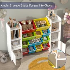 - LARGE STORAGE SPACE – Our oversized multi-functional toy organizers and storage has a combination of 12 plastic toy storage bins, 6 storage cabinet and 2 open shelves that can provide plenty of storage space for all kinds of toys, books and more. The extra large 3-in-1 storage space allows kids to store more of their favourite things. Unlike cubbies, kids don’t have to rifle through closed bins to find their toys.