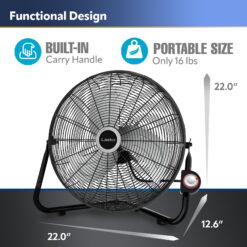 Lasko’s 20″ High Velocity Floor Fan, in black, converts easily from floor use to wall use with the QuickMount wall-mount system. It is designed to be durable, reliable and long lasting, performing on the job day in and day out. This “contractor tough” fan with tubular steel construction features metal blades to deliver maximum air movement at three powerful speeds. Just pivot to direct the air flow and cool large areas with ease.