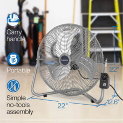 Lasko’s Max Performance 20″ High Velocity Floor Fan or Wall Mount Fan features 3 efficient speeds with metal fan blades to deliver maximum air movement. The included QuickMount® system allows you to easily convert from wall to floor use. The pivoting fan head allows you to direct high velocity air up, down, or anywhere in between making this fan ideal for cooling or ventilation of an area. With a metal fan cage and stand this fan is strong enough to last in workplace settings yet suitable for around the house thanks to built-in rubber pads on the fan stand. This powerful fan features a built-in carry handle for easy portability. ETL Listed. Comes with a 1-year limited warranty.