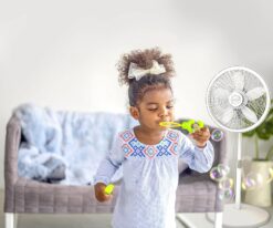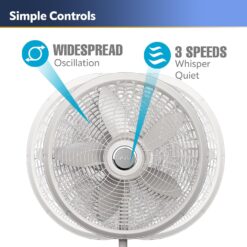 With 90° oscillation and tilt-adjustable fan head, you can set this pedestal fan to blow the air for widespread coverage, creating air circulation throughout the room with a gentle breeze that’s always comfortable. The fully-adjustable height enables you to customize the airflow level. The elegant grill design and the white color blends into surrounding decor easily. Easy to assemble, and comes with a 1-year limited warranty.