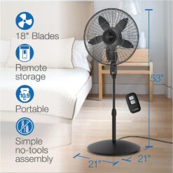 Lasko Oscillating Pedestal Fan, Adjustable Height, Remote Control, 4 Speeds, for Bedroom, Living Room, Home Office and College Dorm Room, 18″, Black, S18440
