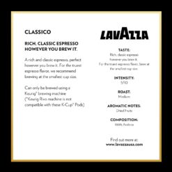 Single-serve K-Cup® with the Lavazza Espresso coffee blend, 88 Count 100% Arabica Intense aromatic flavor Medium Roast Can only be brewed using a Keurig® brewing machine (*Keuring Rivo machine is not compatible with these k-cups)