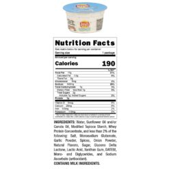 Water, Sunflower Oil and/or Canola Oil,Modified TapiocaStarch, Whey Protein Concentrate, and less than 2% of the following: Salt, Monosodium Glutamate, Garlic Powder, Spices, Onion Powder, Natural Flavors, Sugar, Glucono Delta Lactone, Lactic Acid, Xanthan Gum, DATEM, Mono- and Diglycerides, and Sodium Ascorbate (antioxidant). CONTAINS MILK INGREDIENTS.