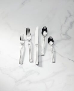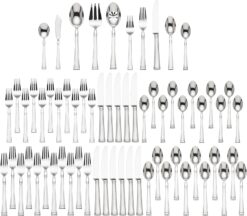 This 65-piece flatware set is a modern, elegant addition to the table, with its subtle ridged edges and tips. Crafted of durable 18/10 stainless steel, this set includes at twelve dinner forks, twelve dinner knives, twelve salad forks, twelve tablespoons, twelve teaspoons, one serving spoon, one serving fork, one pierced serving spoon, one sugar spoon, and one butter knife.