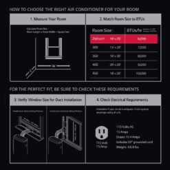 - Estimated cooling area: 250 sq. ft. / Room size: 10 ft. x 25 ft.