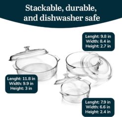- Lead-Free and Stackable: Our oven safe casserole dish is lead-free and stackable for space-saving storage, and the 3-piece glass bakeware set is dishwasher safe for quick and hassle-free cleanup