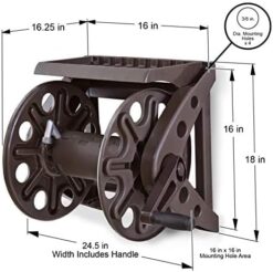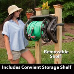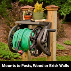 The Liberty Basics 512 Wall Mounted Hose Reel with Shelf is a durable and convenient wall-mounted hose reel with storage shelf and included leader hose. It is constructed with sturdy poly resin (molded plastic) construction that won’t rust and can withstand harsh temperatures and years of outdoor use.