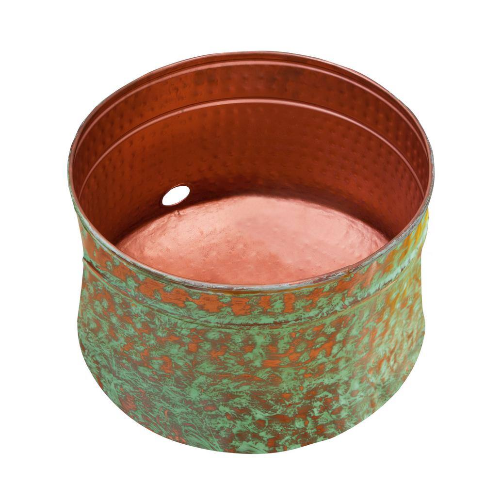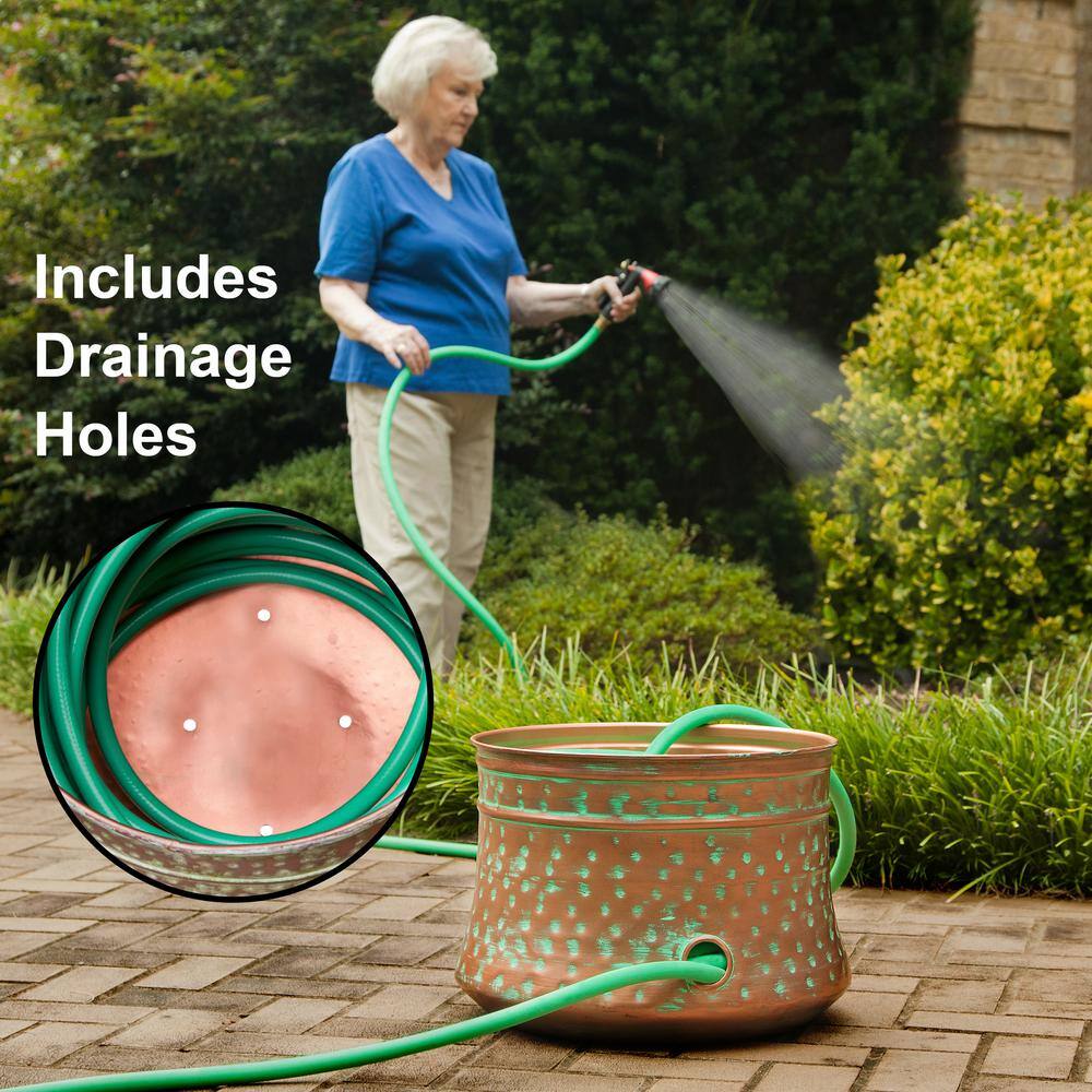 The Liberty model #1917 Hand Hammered Steel Hose Pot with patina copper finish makes hose storage simple and stylish, designed to compliment any home. Built with an inlet port for water/hose connection and drainage holes in the basin, this hose pot can handle all weather conditions while looking weathered on the-day of purchase. This hose pot can also be used as planter if you choose. Patina/Copper finish is hand painted. Color may vary.