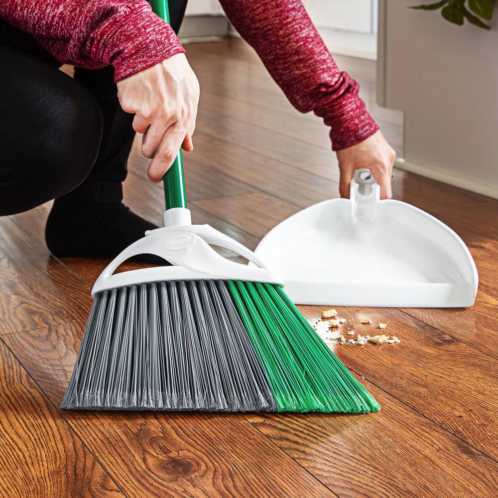 The Libman dustpan and broom set is precisely cut to reach under cabinets and tight corners. Longer life, environmentally-friendly precision angle broom fibers are made from recycled plastic bottles. It is excellent for both indoor and outdoor use. No need for a broom holder or hangers for brooms since this dust pan and broom both have hanger holes at the ends of the handles. The firm, yet flexible bristles make this versatile broom one of the best brooms for outdoor, best brooms for hardwood floors, best brooms for wood floors, and best brooms for wooden floors. The broom dust pan has a smooth, precise edge, which makes it easy to sweep anything in.